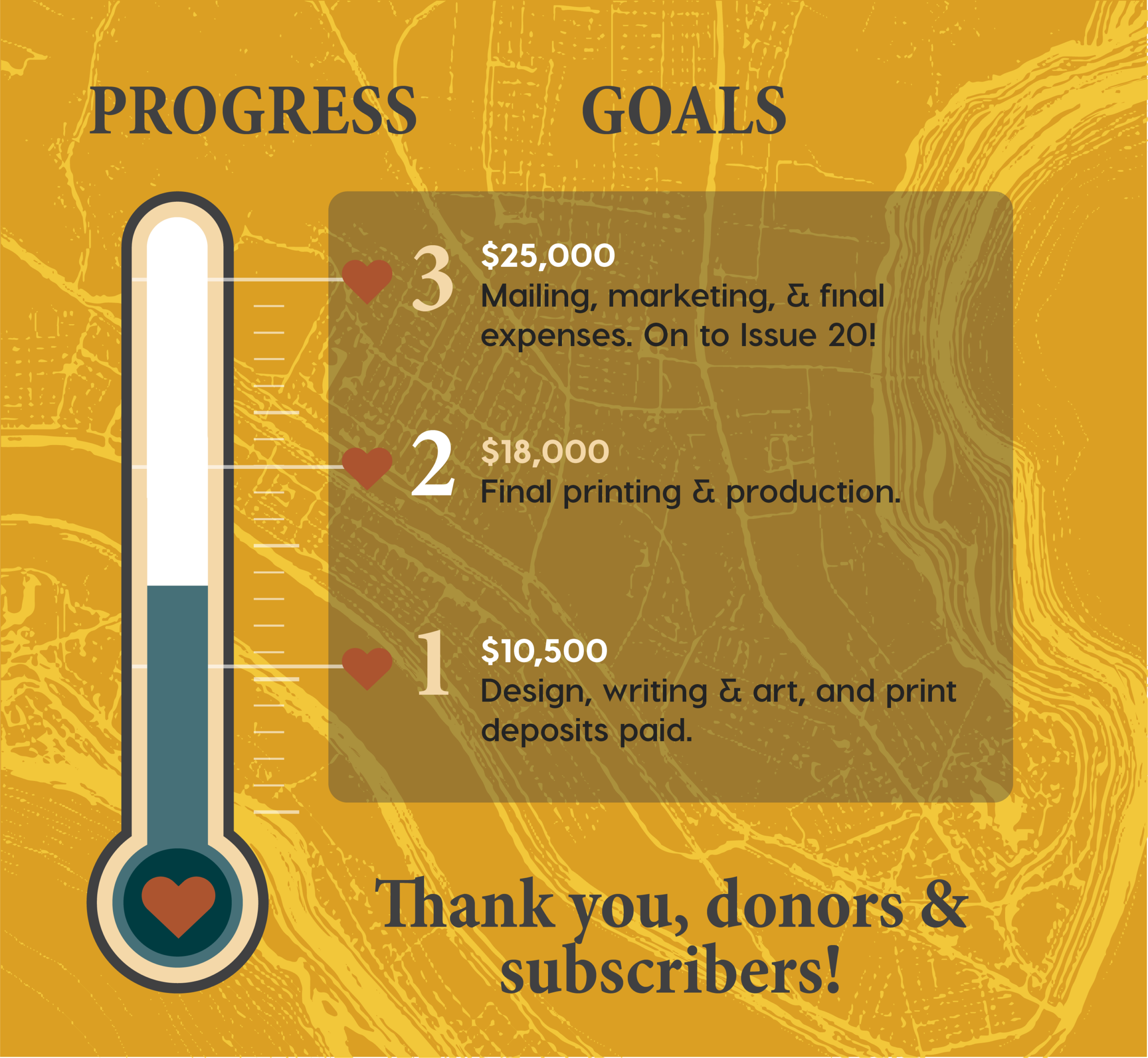 Support the Midwest's writers and artists who explore true, complex stories for this time.Issue 19: Turns of Blue is possible thanks to a matching grant from the Missouri Arts Council, our Patreon supporters, and from sales and donations. Thank you! As of April 23, we’re $11,400 away from our goal.